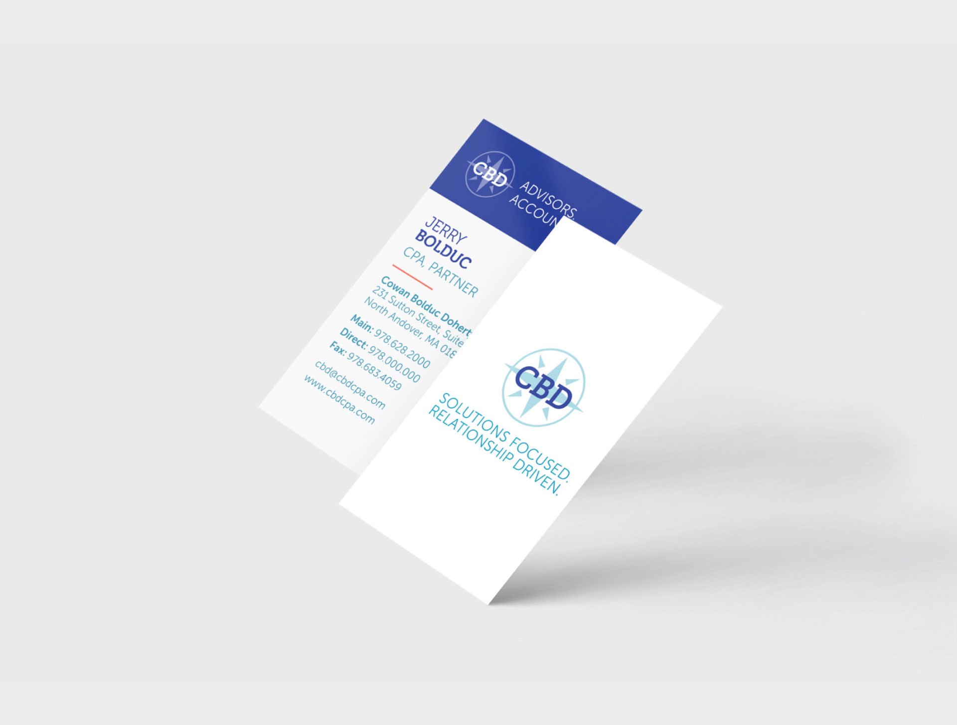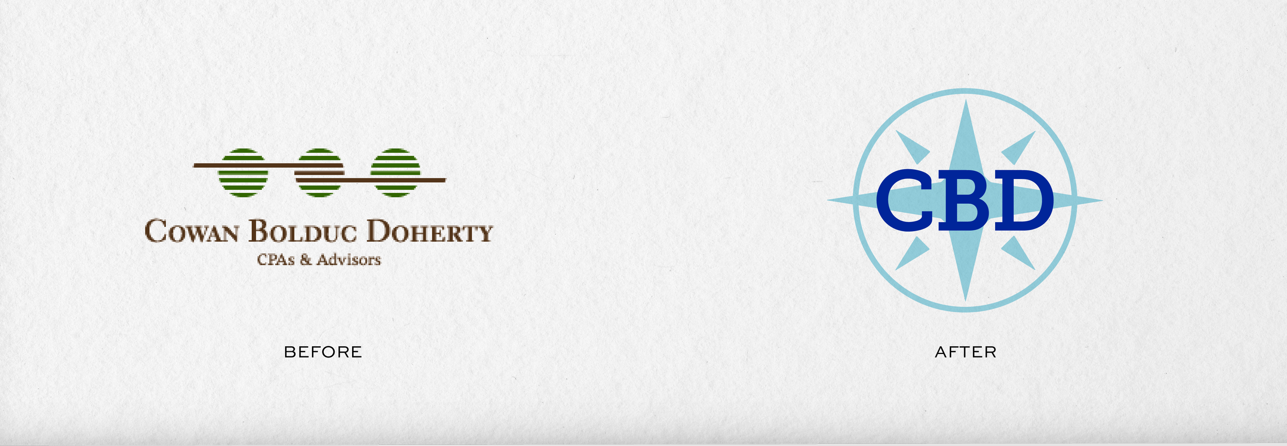 Cowan, Buldoc & Dougherty Accountants were ready to evolve beyond an older, traditional professional services brand rooted in dark greens and gold. The refreshed identity explores a navigational theme, reflecting the role the firm plays in guiding clients through complex tax codes and long-term financial planning. A compass rose became the foundation of the logomark, paired with an abbreviated name set in a modern yet classic typeface to convey trust, stability, and longevity while feeling current and relevant. The color palette was updated to include deep blue and teal green to reinforce the navigational concept, with a restrained splash of Nantucket red to add warmth, distinction, and a subtle New England sensibility.